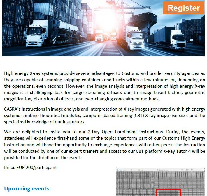 The Center for Adaptive Security Research and Applications (CASRA) cordially invites you to our 2-Day Open Enrollment Instructions in high energy X-ray image analysis and interpretation. During the events, attendees will experience first-hand some of the topics that form part of our Customs High Energy Instruction and will have the opportunity to exchange experiences with other peers. The instruction will be conducted by one of our expert trainers and access to our CBT platform X-Ray Tutor 4 will be provided for the duration of the event. For more information, visit Applications – Customs | CASRA