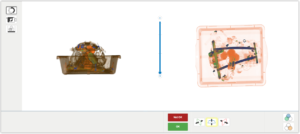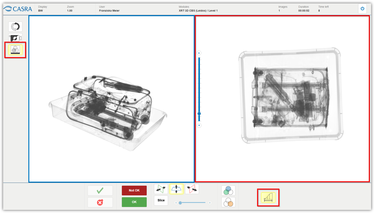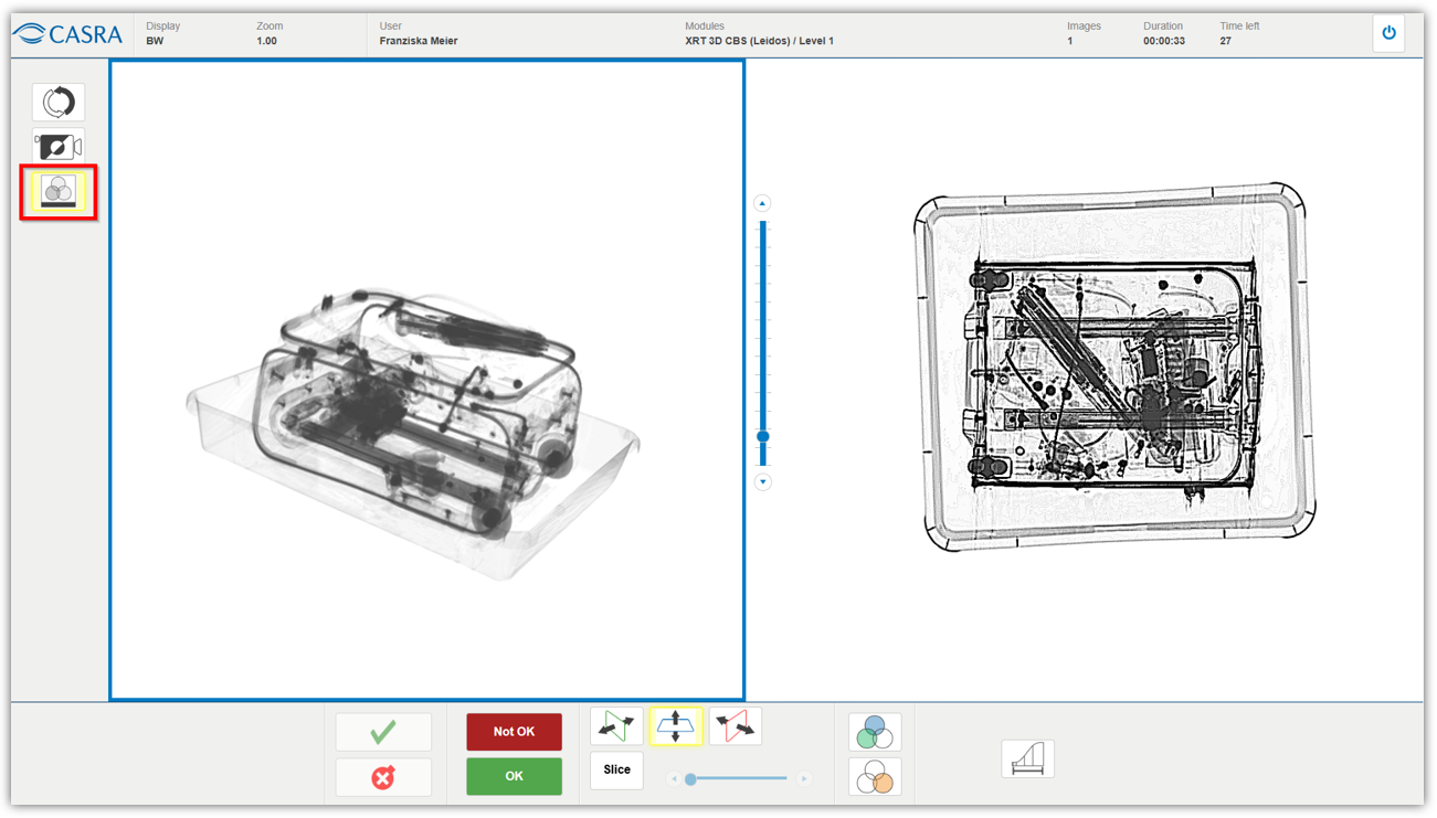 The boxes can be selected and then viewed on the righthand side of the screen in a cropped 3D version for closer inspection. Each of these self-created alarms has to be cleared. This is achieved be either marking it as harmless (green tick icon) or dangerous (red bomb icon). Only when all of the self-drawn boxes are cleared, the simulator lets the user finish evaluating the trials as OK (all alarms are harmless) or Not OK (certain alarms were marked as dangerous). If the user in fact detects a dangerous object, its position has to be marked before the evaluation is completed.