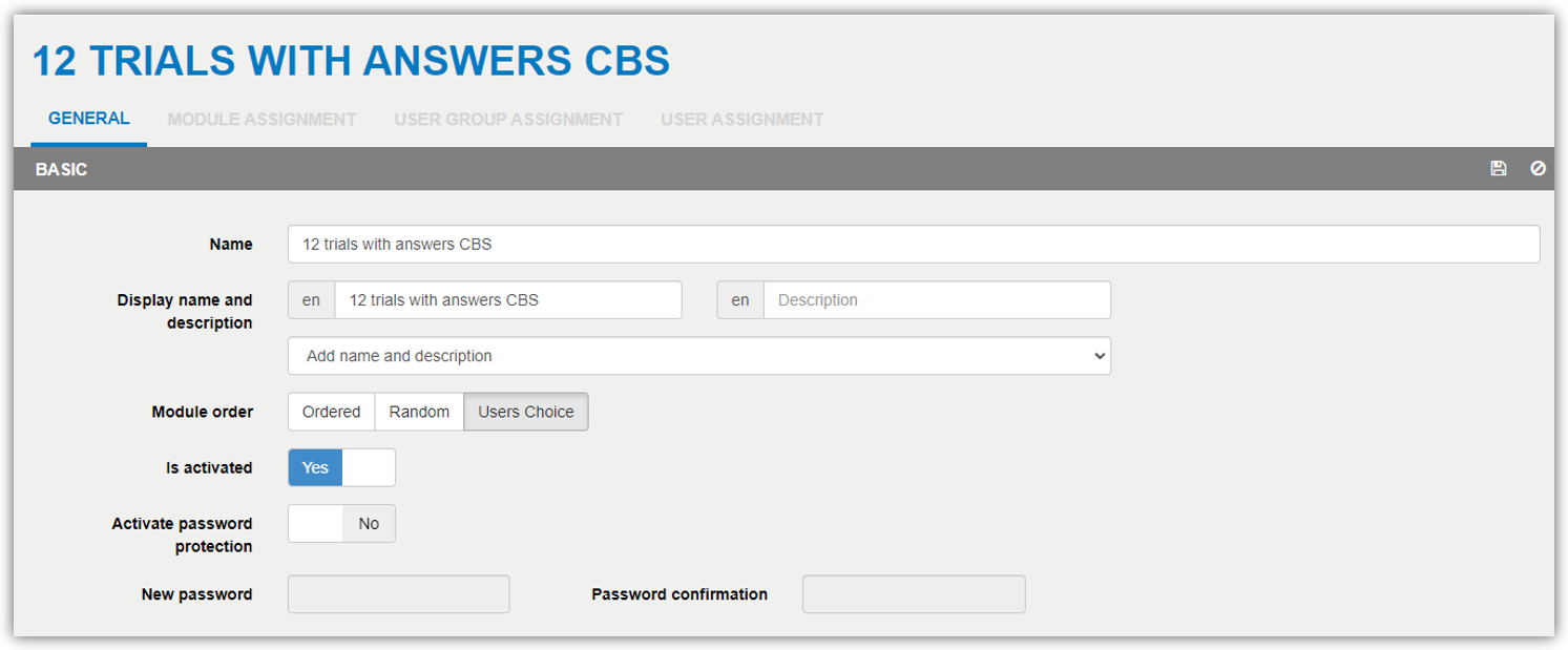 In the Series configuration there is a new option for the module order called ‘user selection’. When activated this feature lets the user decide in what order they want to complete the assigned modules. This results in a dedicated button for each module indicating the start on the home screen. The icons in the front show the different states in which the modules are in (i.e. module in progress, pristine, passed, failed) making it easy for the user to continue the work.