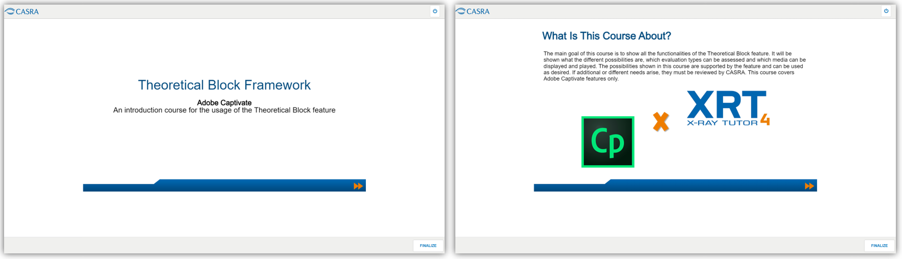XRT4 now provides a functionality to define, execute and evaluate a theoretical exam as an addition to the image interpretation test. It is meant to run e-Learning modules used by XRT4 customers. Theoretical Blocks can be issued individually using an authoring tool. We evaluated and support Captivate by Adobe. By using this program, CASRA can guarantee the transfer of the data to XRT4 as well as the calculation of test results and report times. Theoretical Blocks can be setup, issued and maintained by Administrators or as a service by CASRA.
