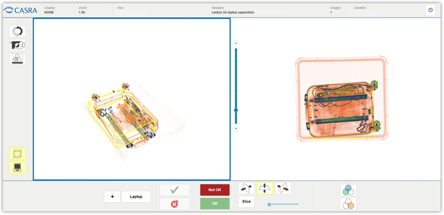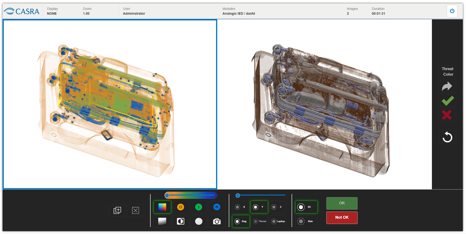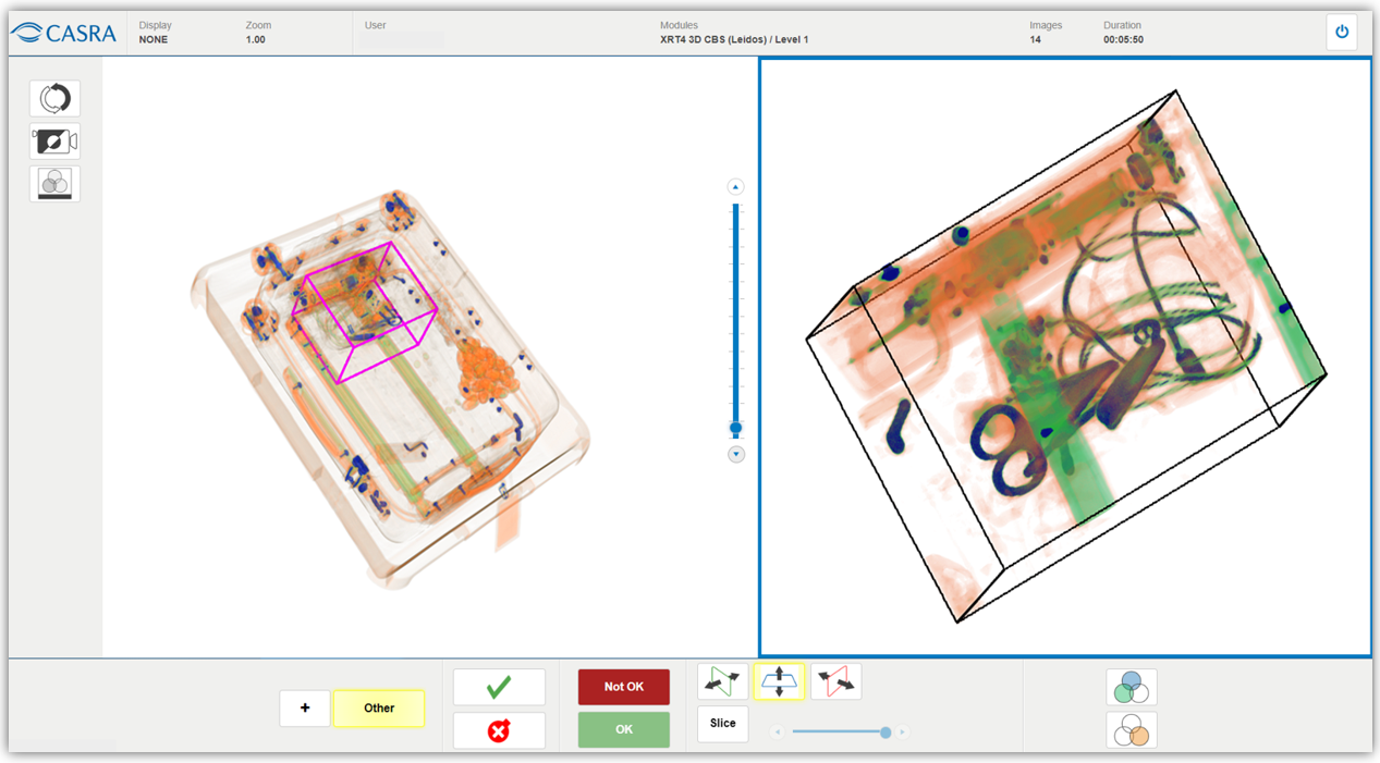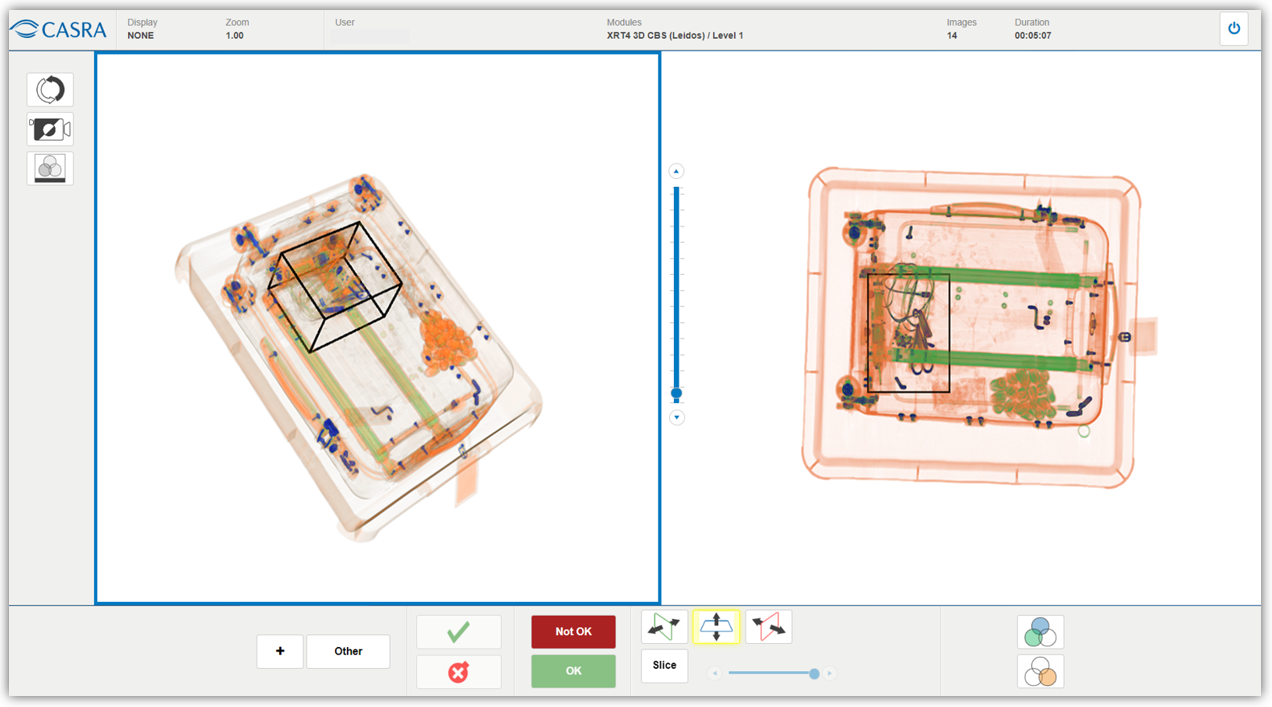 Additionally, a new density slider has been introduced in the UI. The vertical bar in the middle of the two view-ports allows the screener to display the image in either a denser or lighter color scheme, allowing a more accurate decision in regards to threat items.