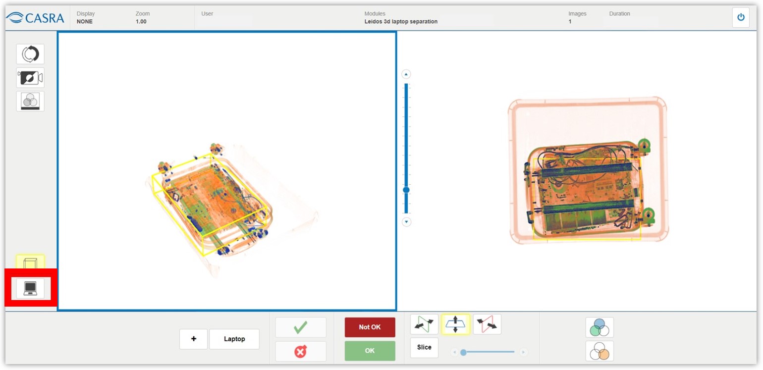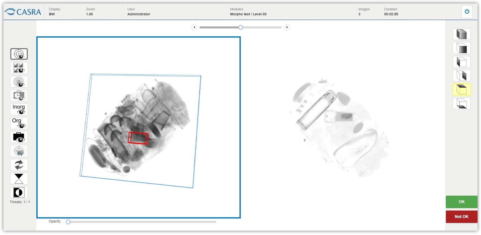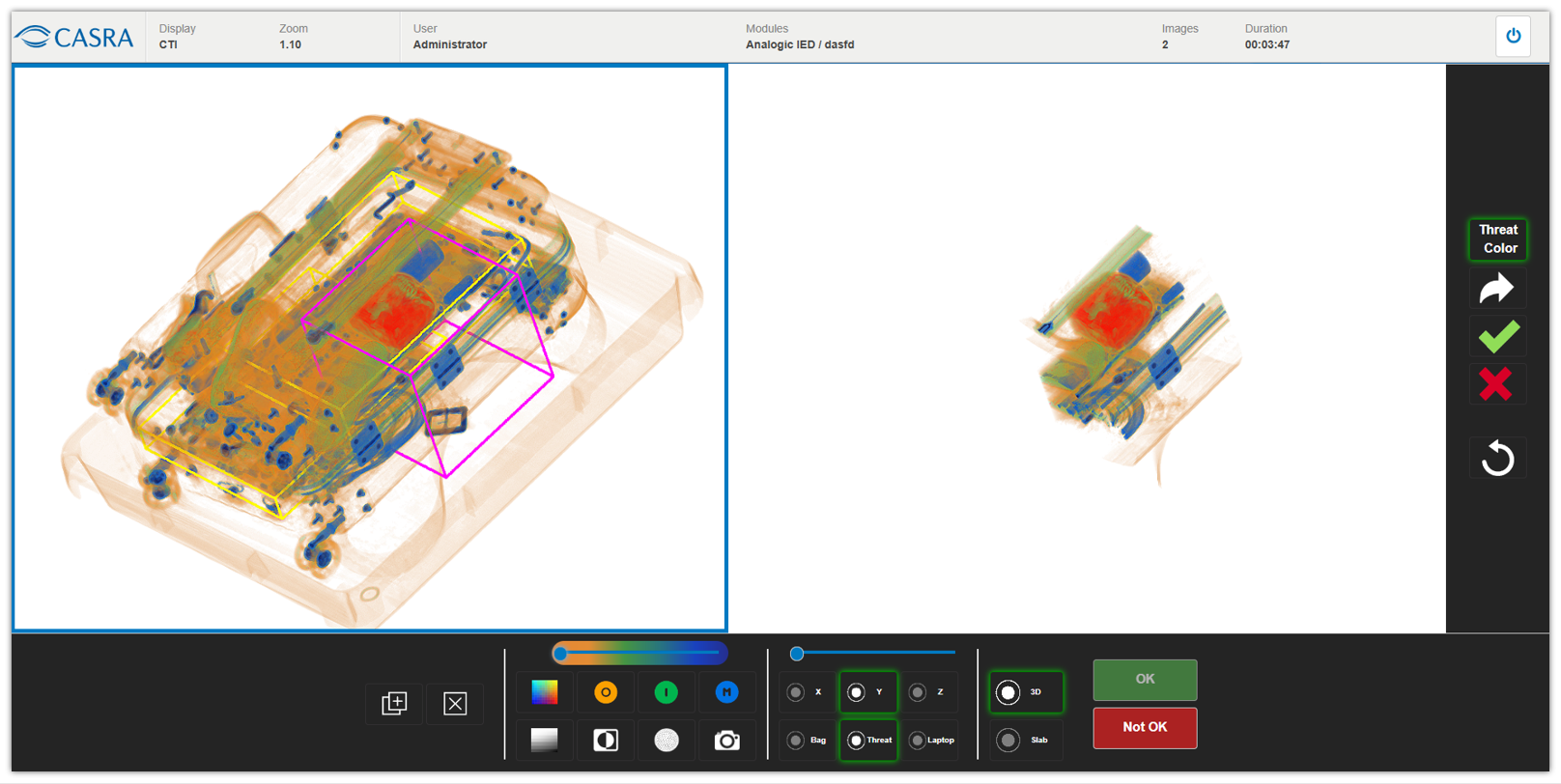 Additionally, a new density slider has been introduced in the UI. The vertical bar in the middle of the two view-ports allows the screener to display the image in either a denser or lighter color scheme, allowing a more accurate decision in regards to threat items.