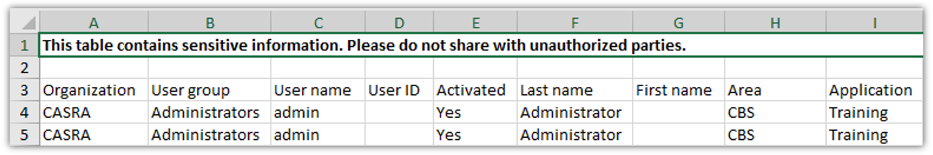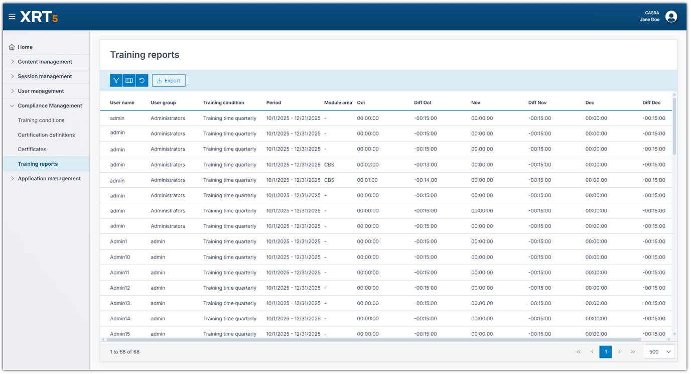 The set training conditions in the compliance management can be viewed by administrators in the specific training report. Unlike the other reports that can be found in the user menu, the training report is located in the compliance management and only accessible to administrators. The data is dynamically calculated based on the defined training conditions. The data displayed shows with calculated differences where users are missing training time. Each training condition has its own report. They can be exported in either Excel or PDF format.