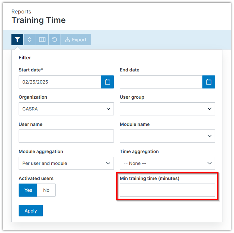 The filter in the training time report was extended with the option to add a value for the minimal training time. This allows administrators to filter out short training sessions that should not be part of the reporting.The filter is dynamic and the minimal training time can be set individually every time a report is issued.