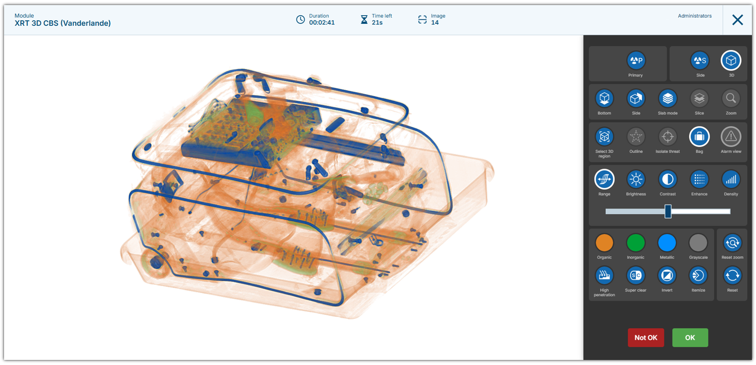 The 3D simulator for the Smiths Detection user interface has been part of XRT for over 8 years. Due to technological advances and various feedback, we took it upon ourselves to completely relaunch the simulator. The main focus lies on the image quality that now reflects the one from the machine in a much better quality. The coloring and behavior is as closely as possibly mirrored to the machines due to a specifically developed 3D edge enhancement and an image shader functionality that is based on the coloring of the CTiX machine. Meanwhile the UI itself still reflects XRT5’s design and fits in seamlessly with the rest of the software. There were no changes made to any of the data, meaning no training data was lost and there is no change in the reports. All the modules now run on the new UI. There is no action required from either the user or administrators.