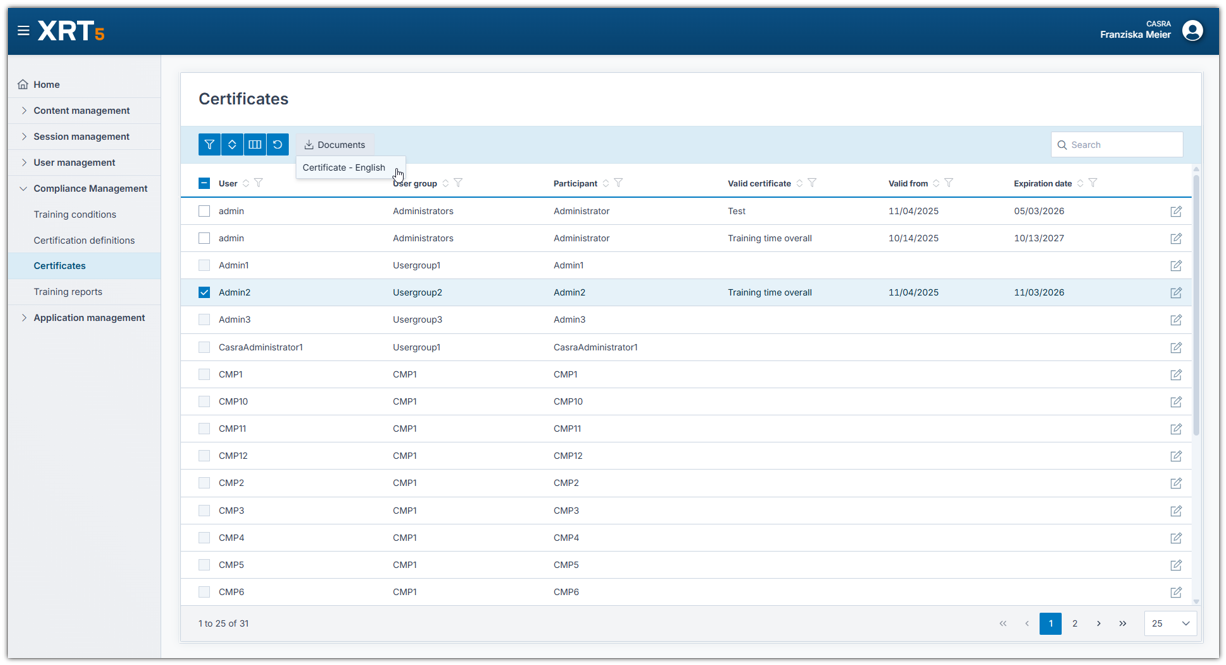 Based on the set training conditions, certifications can be defined and issued. The certificates can be directly linked to a document template. This then allows the administrator to download either .docx or .pdf files that have been previously designed with a corporate-issued layout.