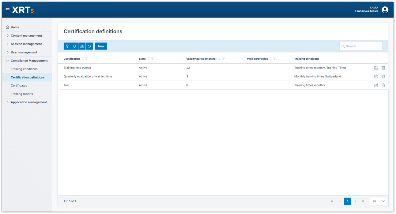 There is a new dashboard available on the home screen for every user to show different sets of data of their individual training times. In the administrators navigation menu there is a new entry point “Compliance management”. In there, specific training conditions can be set up according to your compliance regulations. To create a new training time condition you set a title, select the range (year, half-year, quarter, month), an equal or smaller interval (year, half-year, quarter, month), the target training time in minutes and the reference point of when it should start (calendar, current date or the certification validity). Simply assign a training condition to the respective user group and it will show up on their dashboard. This assures that all users see at one glance if they are within the regulations.