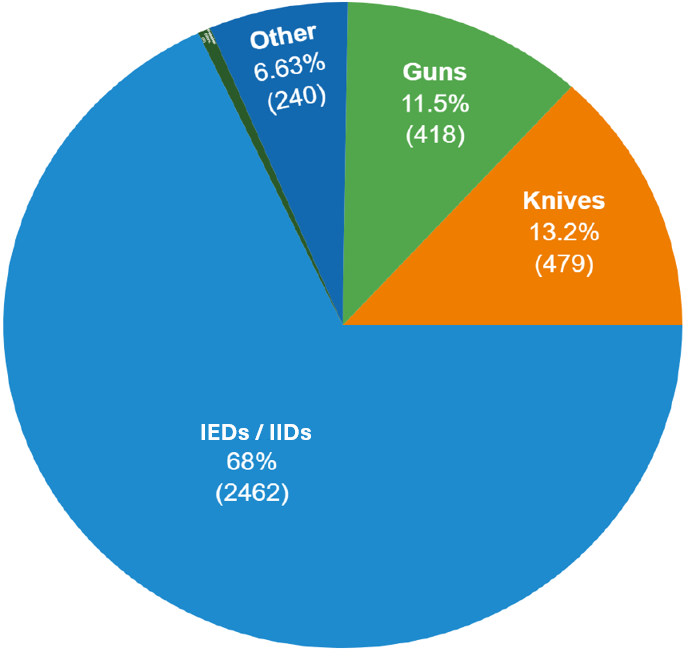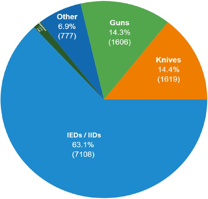 There are five different categories in the CBS modules: guns, knives, IEDs/IIDs and explosives