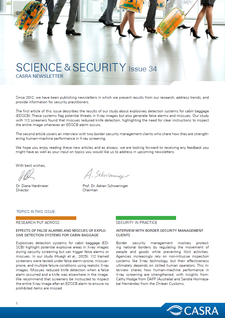 EFFECTS OF FALSE ALARMS AND MISCUES OF EXPLOSIVE DETECTION SYSTEMS FOR CABIN BAGGAGE Explosives detection systems for cabin baggage (EDSCB) highlight potential explosive areas in X-ray images during security screening but can trigger false alarms or miscues. In our study (Huegli et al., 2025), 112 trained screeners were tested under false alarm–prone, miscue–prone, and multiple failure conditions using realistic X-ray images. Miscues reduced knife detection when a false alarm occurred and a knife was elsewhere in the image. We recommend that screeners be instructed to inspect the entire X-ray image after an EDSCB alarm to ensure no prohibited items are missed. INTERVIEW WITH BORDER SECURITY MANAGEMENT CLIENTS